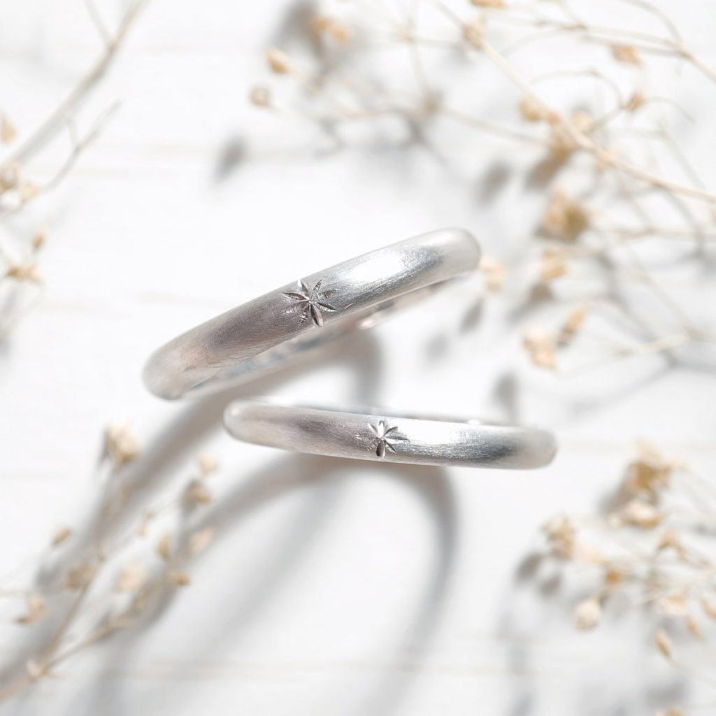 PT900素材の手作り結婚指輪。 全面粗めのヘアラインを加えています。 星彫りもワンポイントで。