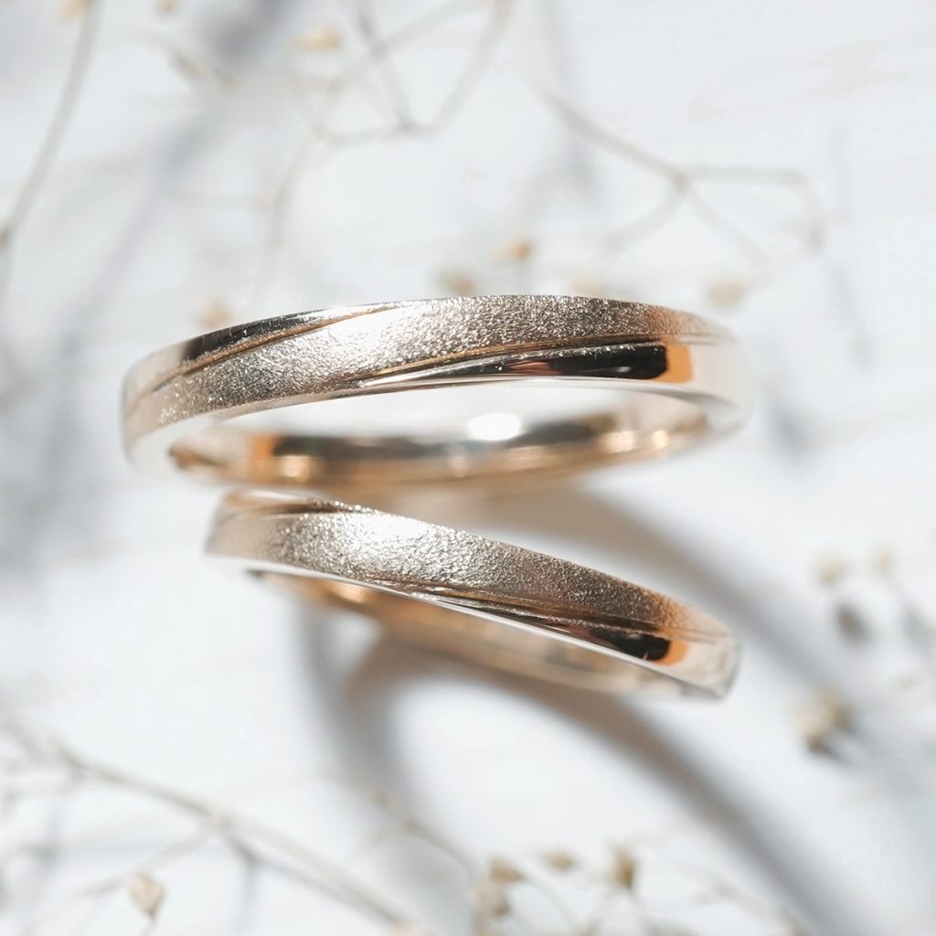 K18イエローゴールド素材の手作り結婚指輪。 長めのラインを筋付けし、中央部分のラインに光沢梨地を加えています。 シンプルにオリジナルが溢れる指輪です。
