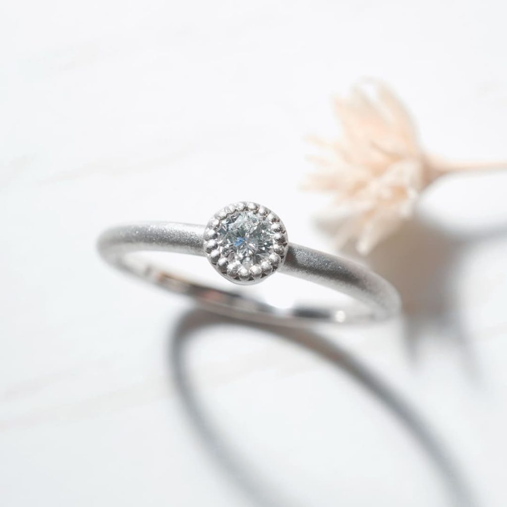 覆輪留めの婚約指輪。素材はプラチナで、全体的につや消し加工を施しています。