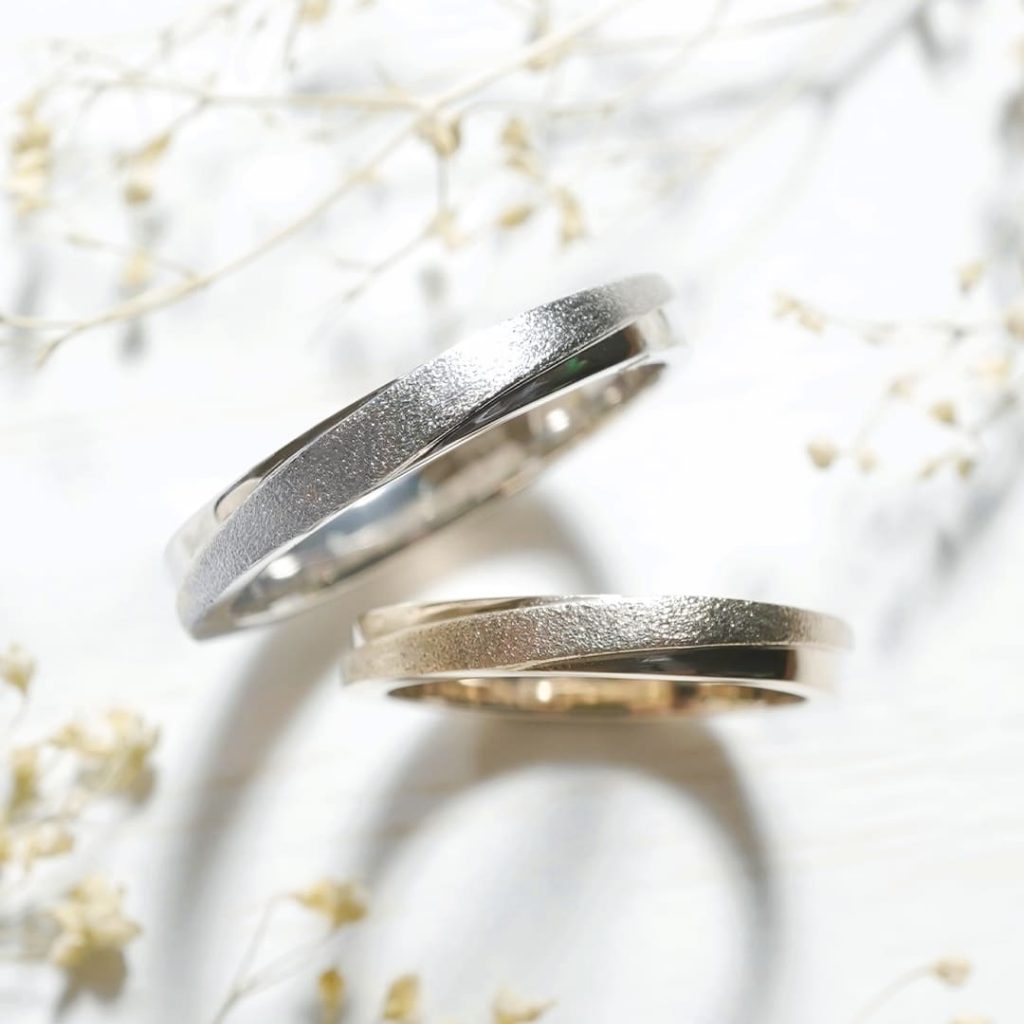 上中下で段差を付け、中央のラインのみ浮き上がるようなデザイン。 上はプラチナで下はK18シャンパンゴールド。 中央ラインにはつや消しを加えています。