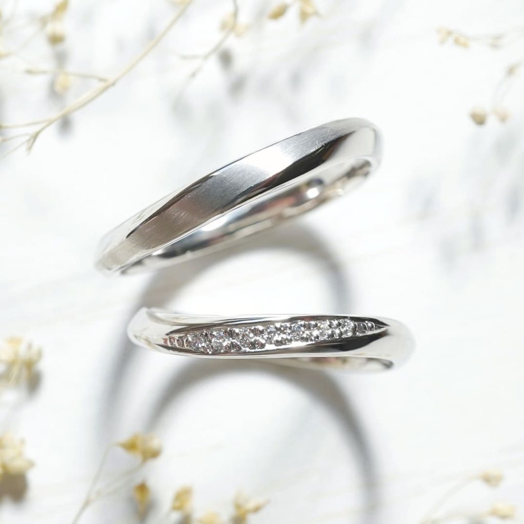 S字型の形状が可愛らしい結婚指輪。 上のリングにはヘアライン加工を、下のリングはラインに沿ってダイヤモンドを7石留めています。