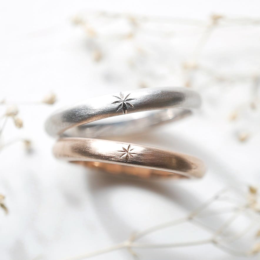 上のリングはプラチナ、下のリングはK18ピンク素材。
