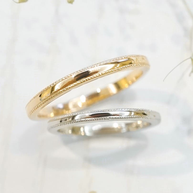 平甲丸な形状にミルグレインを可愛く加えた手作り結婚指輪。 上のリングはK18イエローゴールド。下のリングはプラチナ素材です。 シンプルで飽きの来ないデザイン。