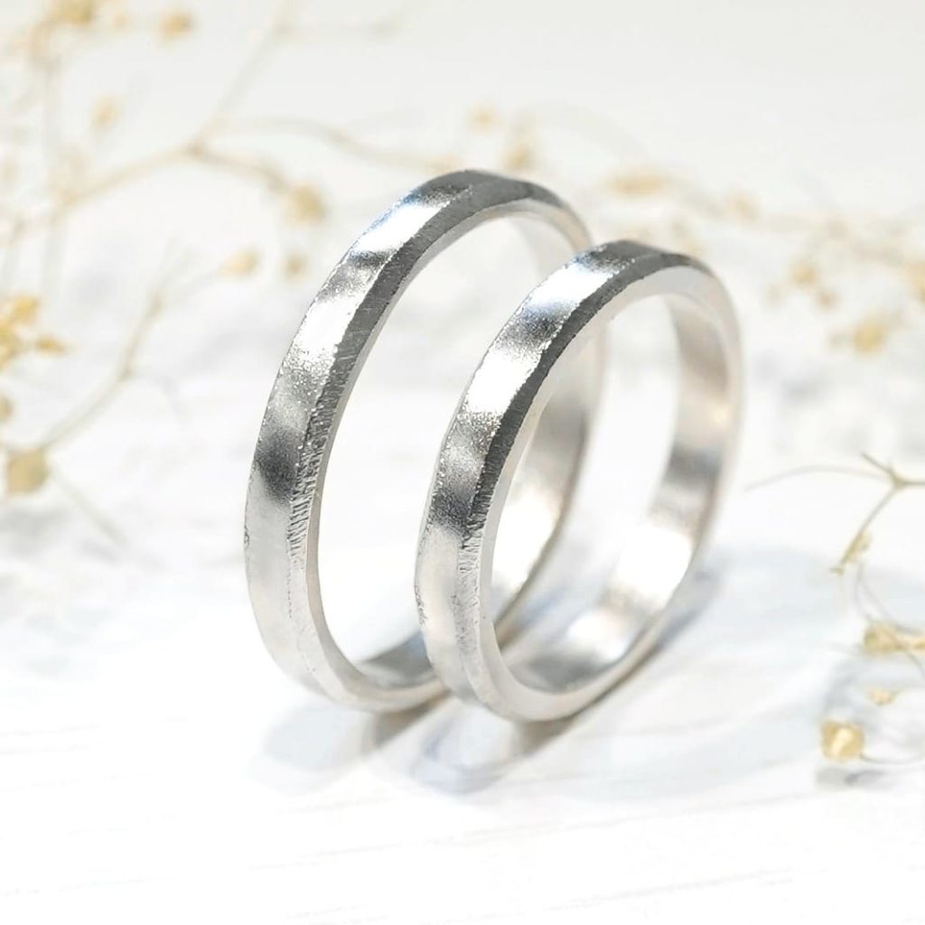 プラチナ900の手作り結婚指輪。 どちらも側面角をオリジナルに削っています。 全体的に光沢有りのつや消しを加えています。