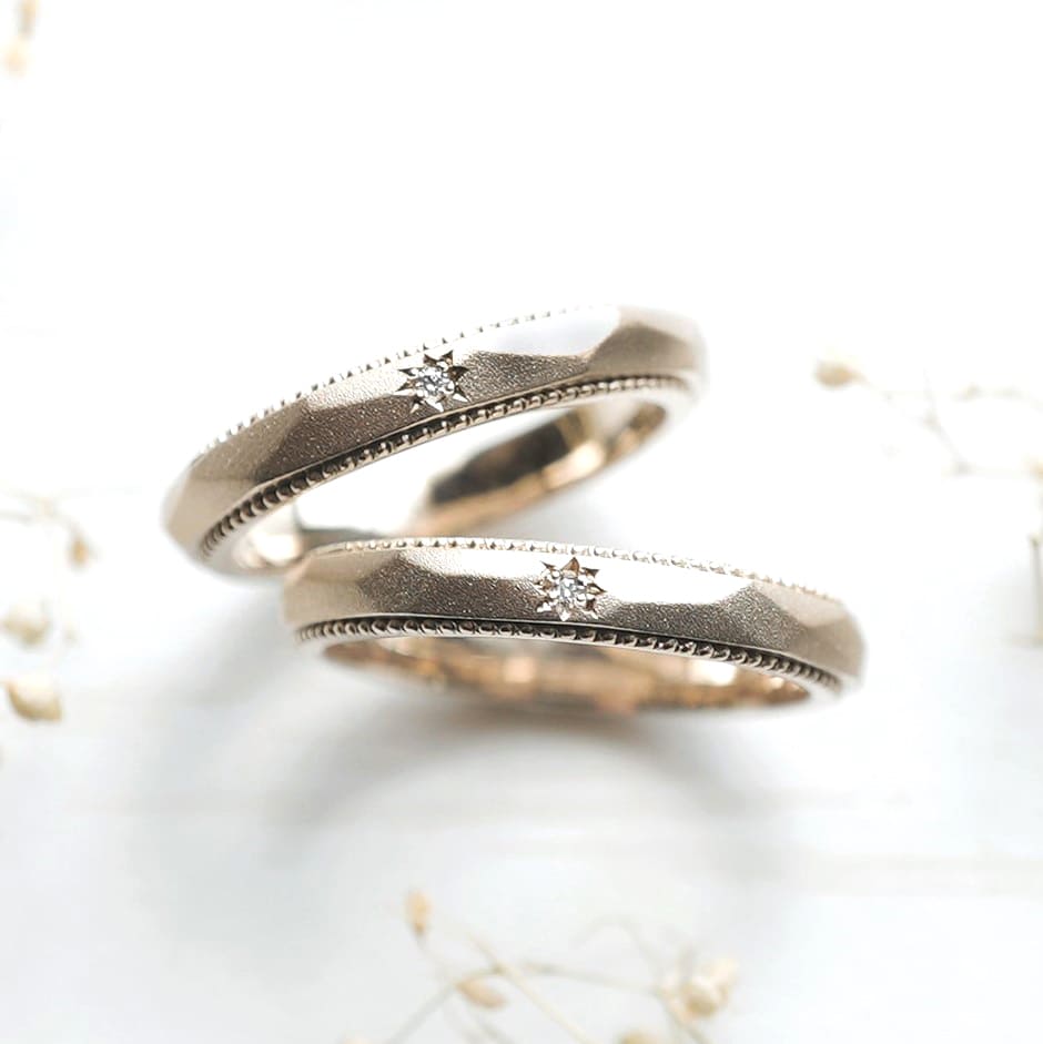 K18シャンパンゴールド素材の手作り結婚指輪。 表面に柔らかめな鎚目模様をつけ、つや消し加工を施しています。 中央には星彫りのうえ、ホワイトダイヤモンドを留めています。