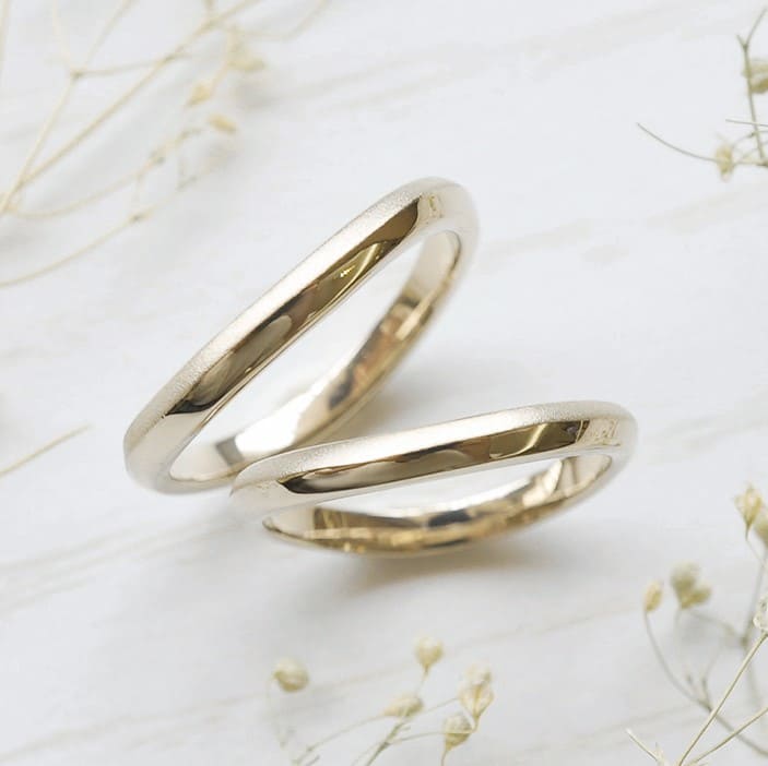 ウェーブに中央で山なりに角度を付けて作製した結婚指輪。 素材はK18シャンパンゴールド。 中央を境目に、片方はホーニング加工、もう片方は鏡面仕上げでお作りしています。