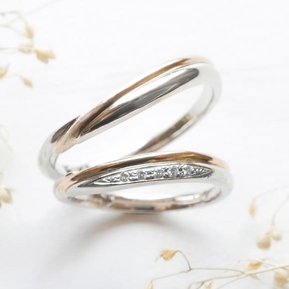 プラチナ900とK18ピンクゴールドが組み合わさった手作り結婚指輪。 奥様のリングにはダイヤモンドが5石埋め込まれています。