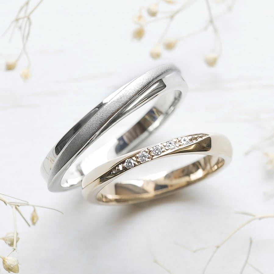 上のリングはプラチナ900素材、中央ラインが浮き出ている手作り指輪。 奥様のリングはメビウス形状、素材はK18シャンパンゴールドでダイヤモンドが5石留まっています。