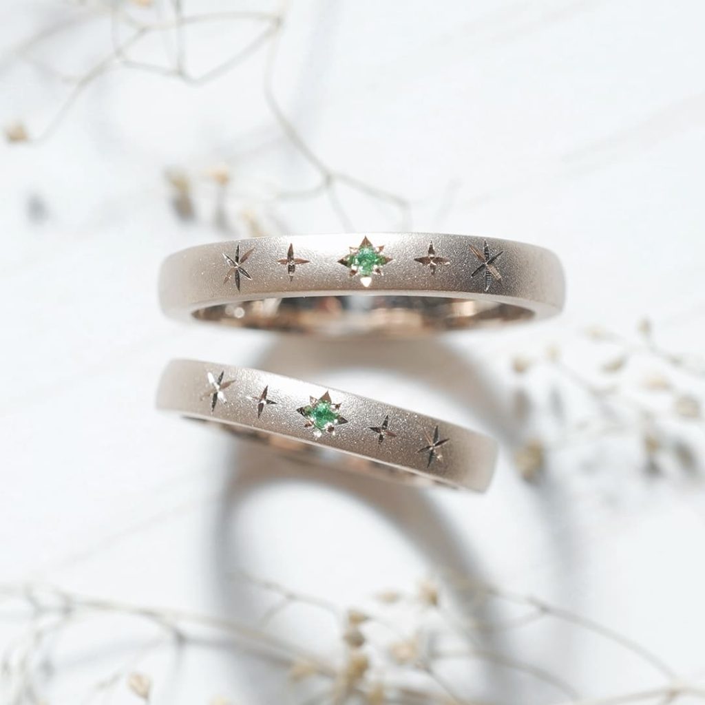 K18シャンパンゴールドでお作りいただいた結婚指輪。 指輪表面は星彫りとエメラルドを留めています。 個性的で可愛らしい指輪です。