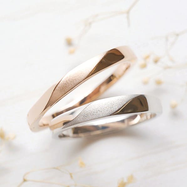 ひねりが美しい曲線を描く手作り結婚指輪。 奥様はK18ピンクゴールド素材、旦那様はプラチナ900素材です。 どちらも中央ラインはつや消し加工を施しています。