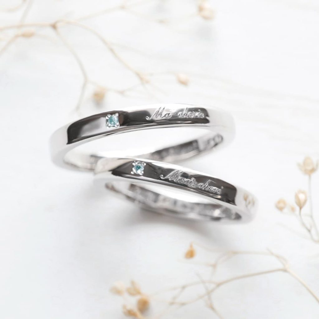 どちらも彫金製作コースでお作りいただいた平甲丸タイプのストレートリング。 素材はプラチナ900。表面にはオプションでアクアマリンを留め、筆記体で文字を入れています。