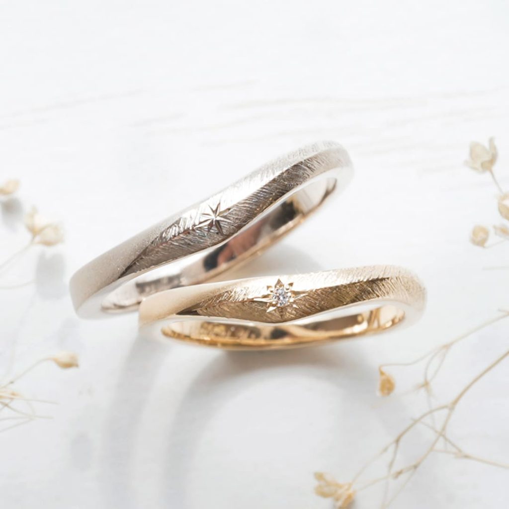 中央には星彫り加工を施し、奥様のリングにはホワイトダイヤモンドを1石加えています。
