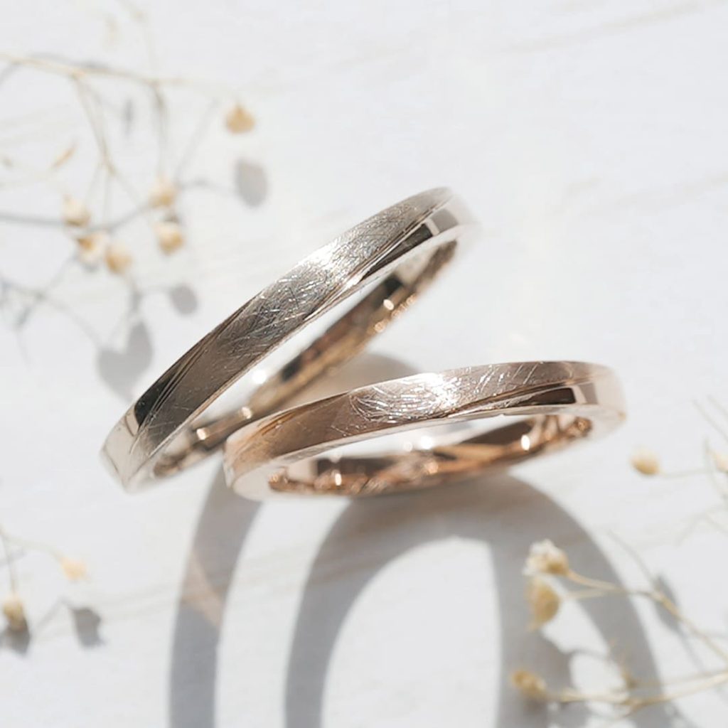 ストレート形状の手作り結婚指輪。 中央にはラインを加え、アンティーク加工を施しています。 上のリングはK18シャンパンゴールド、下のリングはK18ピンクゴールド素材です。