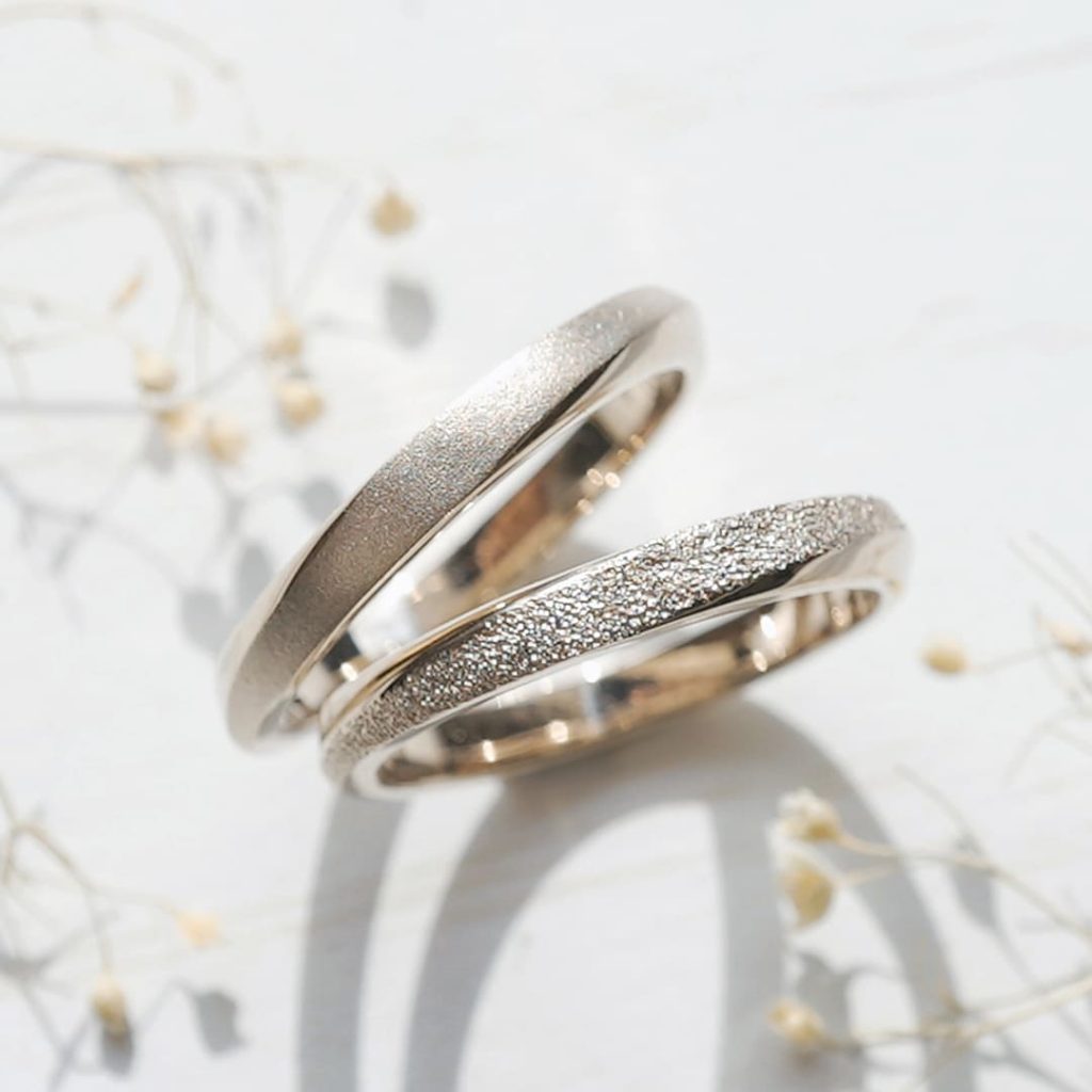 K18シャンパンゴールド素材の手作り結婚指輪。 長いひねりが特徴的なリング。 上のリングは中央ラインにつや消し加工。 下のリングはスターダスト加工を施しています。