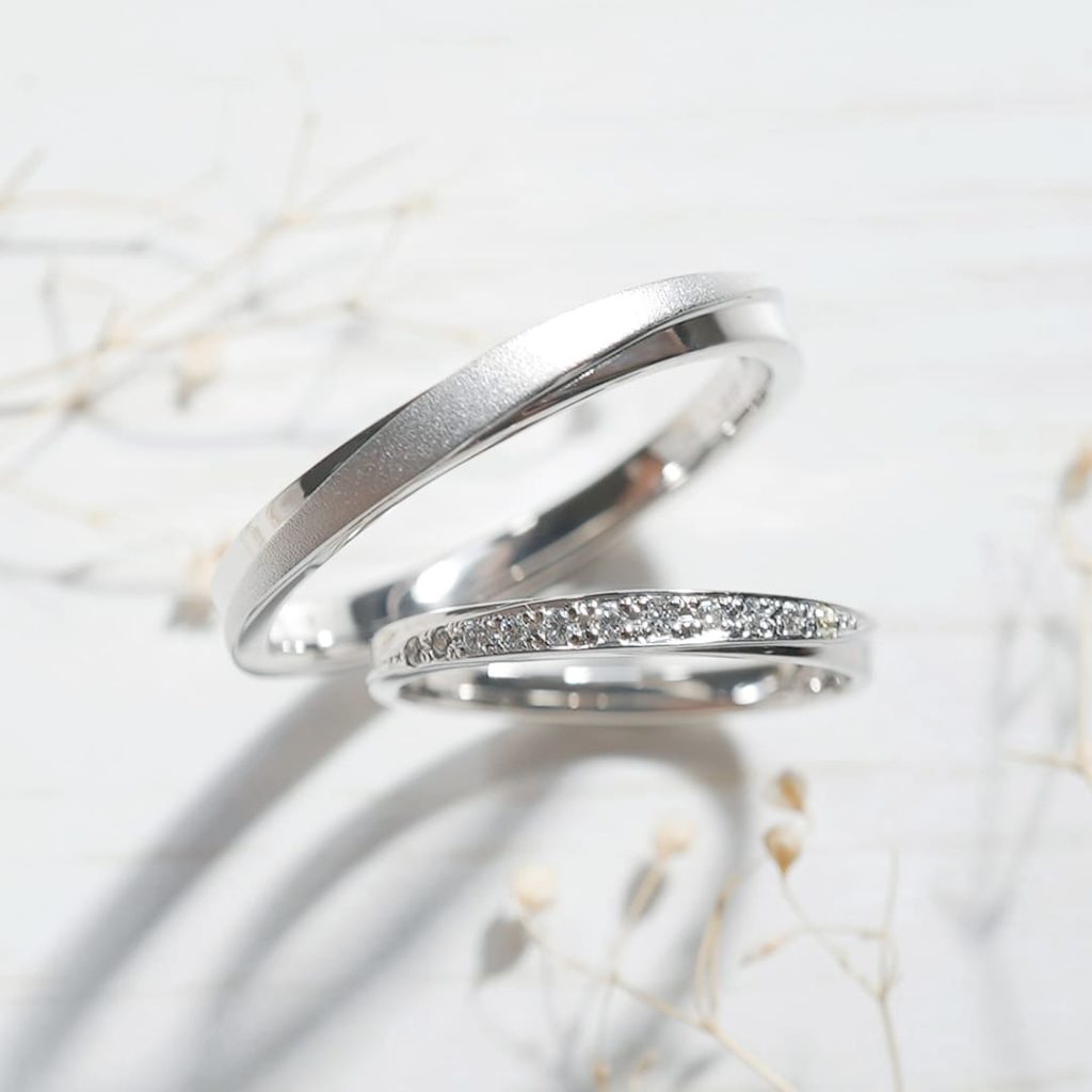 どちらもプラチナ900素材の手作り結婚指輪。 中央ラインを浮かしたデザインで、旦那様は艶消し加工を。 奥様はダイヤモンドを10石、ペリドットを1石留めています。