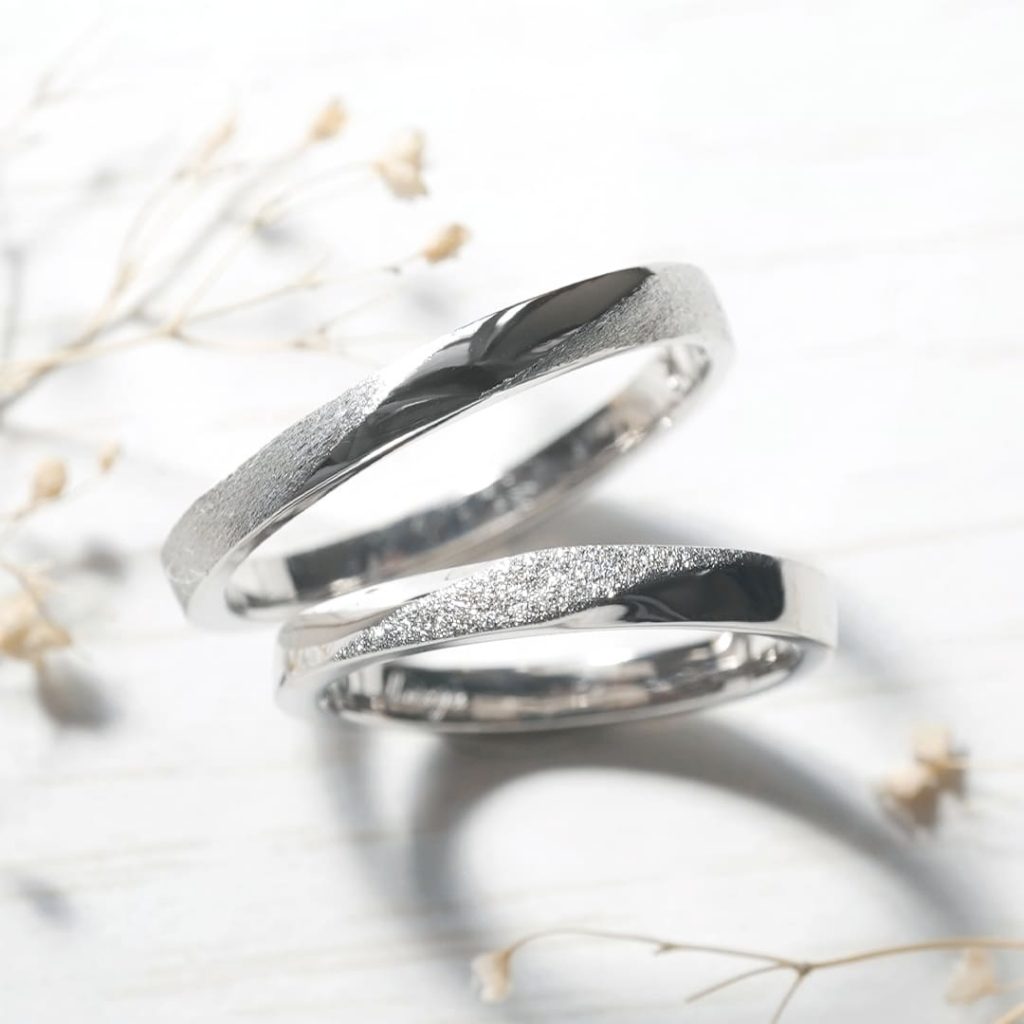ひねりデザインの手作り結婚指輪。 どちらもプラチナ900素材です。 上のリングは中央ライン以外をダイヤモンドポイント加工を。 下のリングは中央ラインにダイヤモンドパウダー加工を施しています。