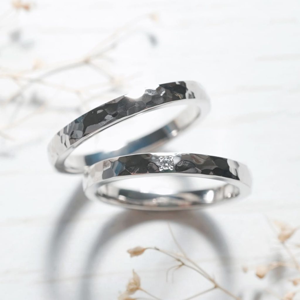 オリジナルの鎚目に仕上げ、奥様リングのみダイヤモンドを1石加えた手作り結婚指輪。 どちらもプラチナ900素材。