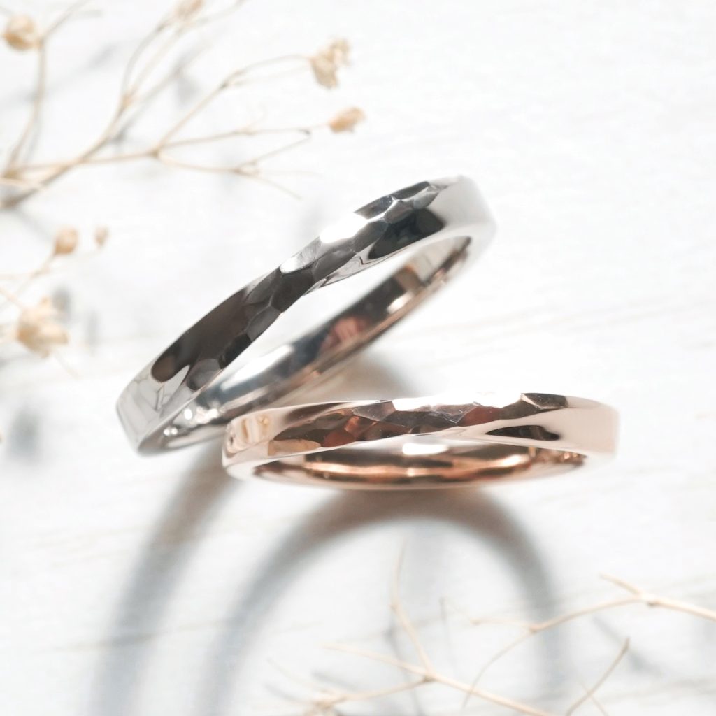 メビウスデザインの手作り結婚指輪。 中央ラインには槌目加工を施しています。 上のリングはK18ホワイトゴールド。 下のリングはK18ピンクゴールド素材です。