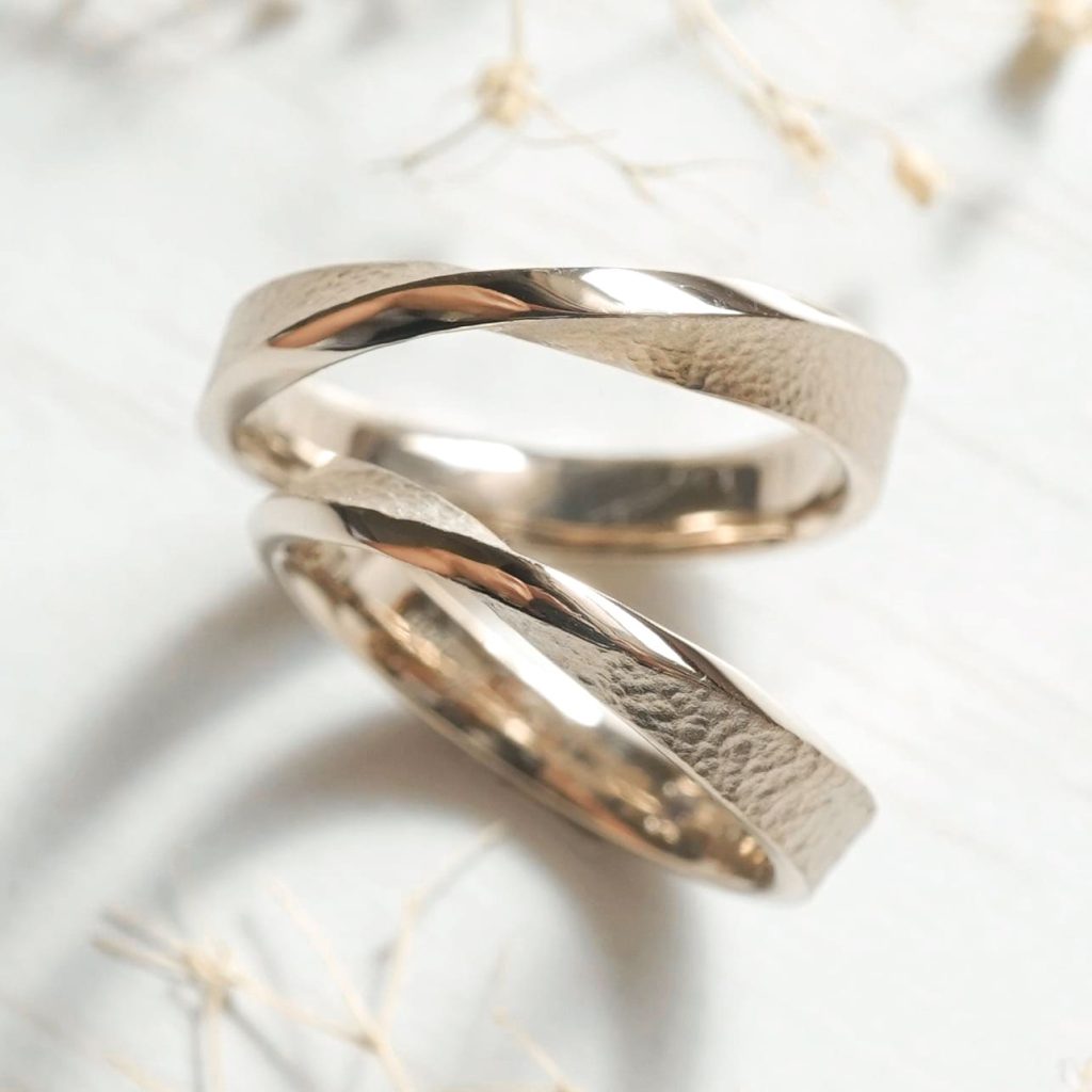 メビウスタイプの手作り結婚指輪。 中央ラインはピカピカな光沢仕上げ。 側面は細かめの槌目加工に艶消しを施しています。 どちらもK18シャンパンゴールド素材です。