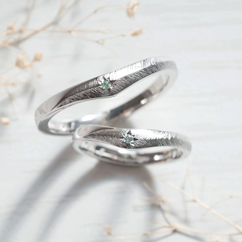 プラチナ素材の手作り結婚指輪。 少しV字形状に作製し、中央には星彫りの上、アクアマリンとエメラルドを留めています。 周りにはフェザー加工を施し、スタイリッシュに仕上げています。