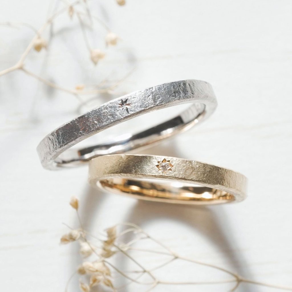 奥様リングには星彫りのうえ、ダイヤモンドを1石加えています。