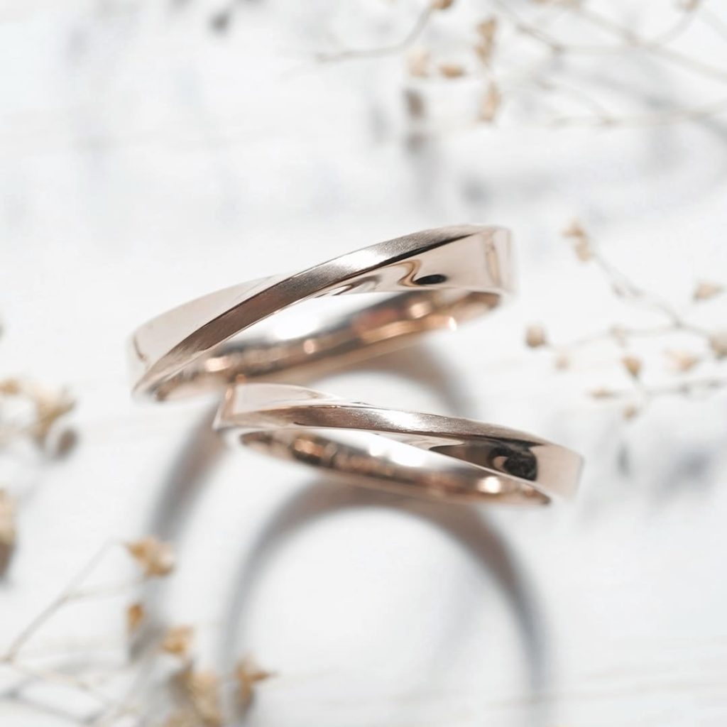 どちらもK18シャンパンゴールド素材です。 真ん中のラインにはヘアライン加工を施しています。