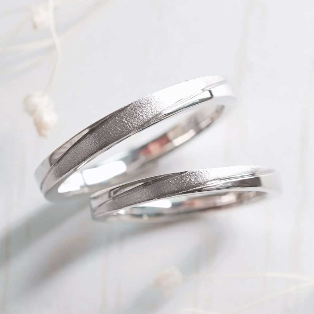 シンプルなストレートデザインに斜めのラインを付けた手作り結婚指輪。 中央ラインは光沢梨地加工を施しています。 素材はどちらもプラチナ900です。