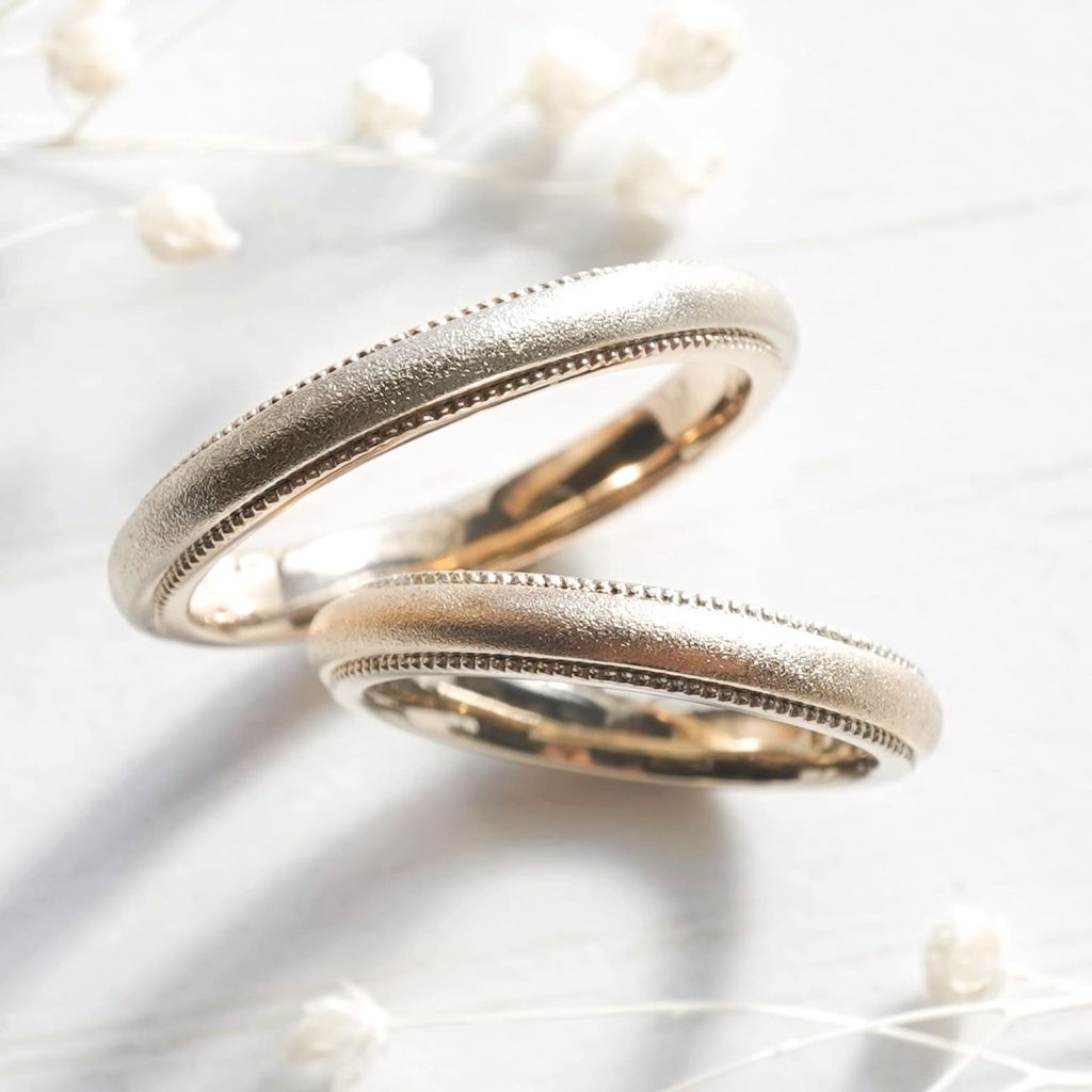 旦那様リングの表面はK18シャンパンゴールド、ミルグレインと内側はK18ピンクゴールド素材です。