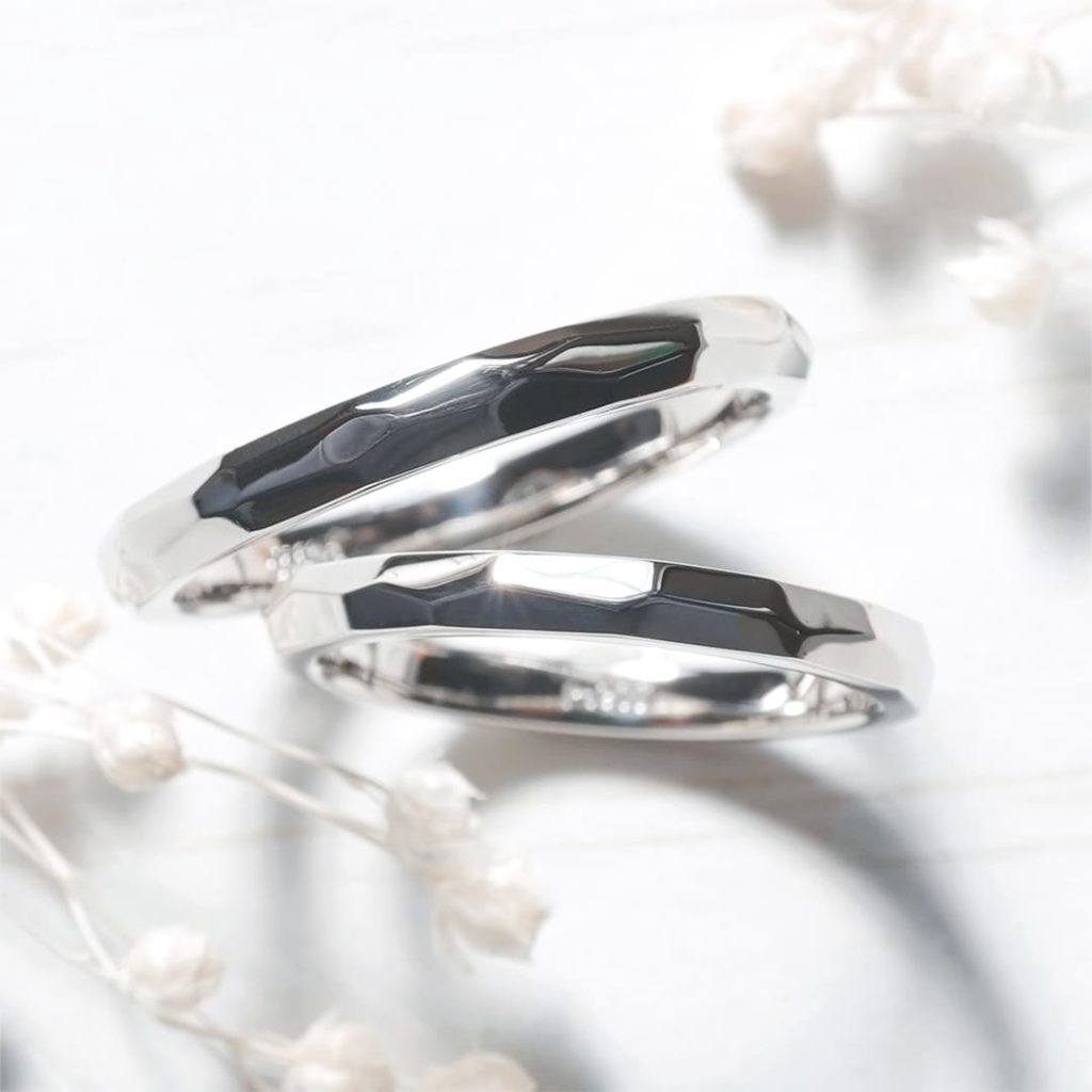 それぞれの断面があらゆる方向に輝く手作り結婚指輪。 どちらもプラチナ900素材で表面はポリッシュ仕上げです。 オリジナルの凸凹感が魅力的です。