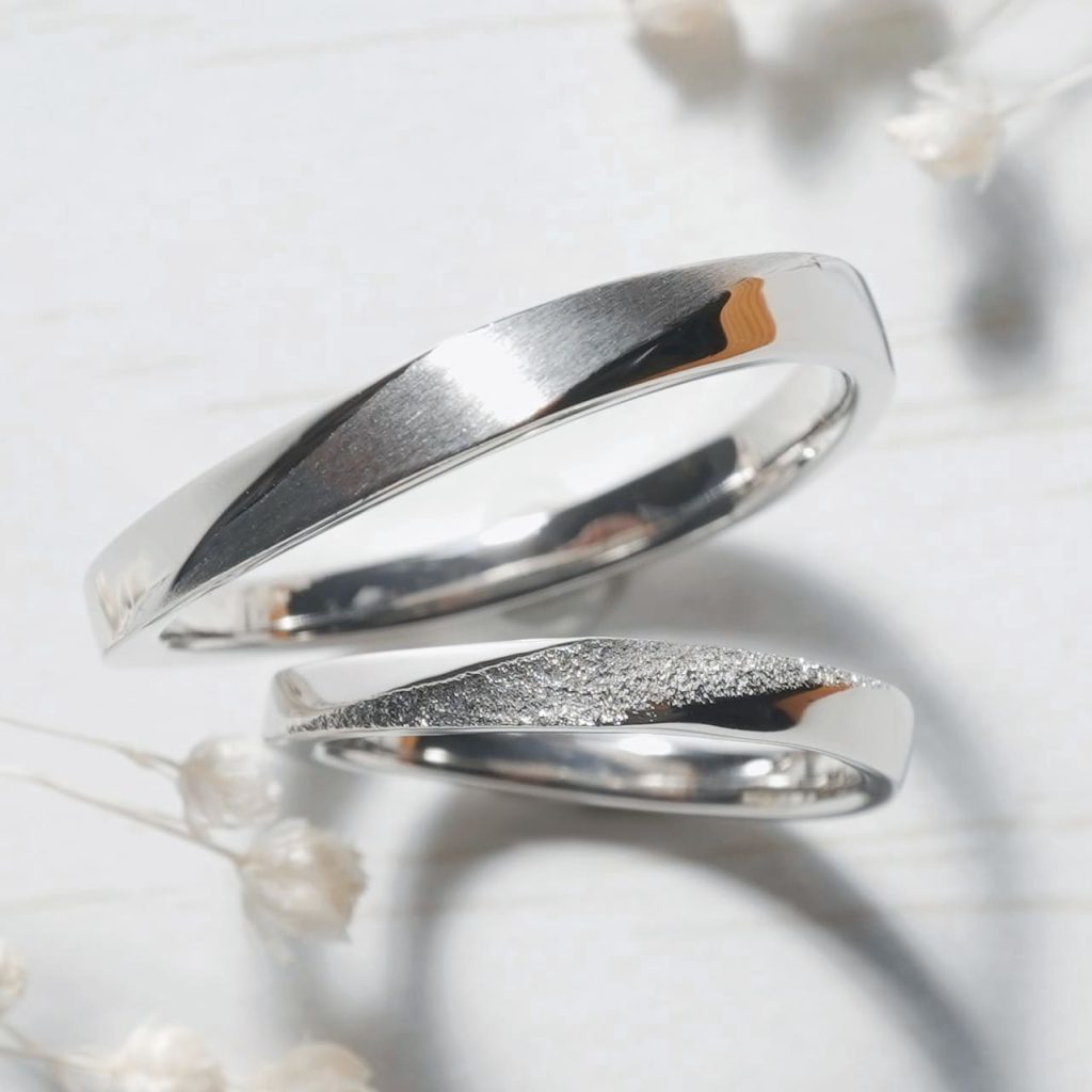 どちらもプラチナ素材で、上のリングは中央部分にヘアライン加工を。