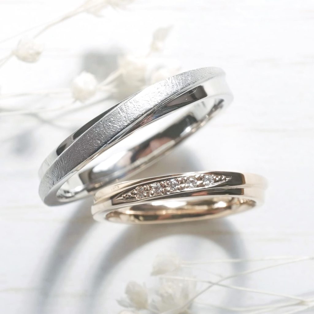 上のリングはプラチナ900素材、中央に梨地加工を施しています。