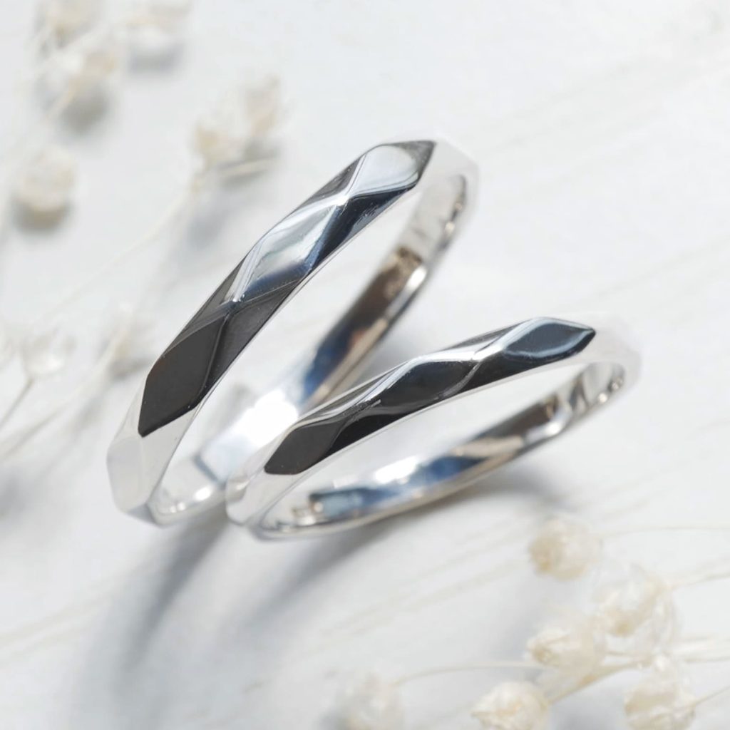ひし形模様がキラキラと輝く手作り結婚指輪。