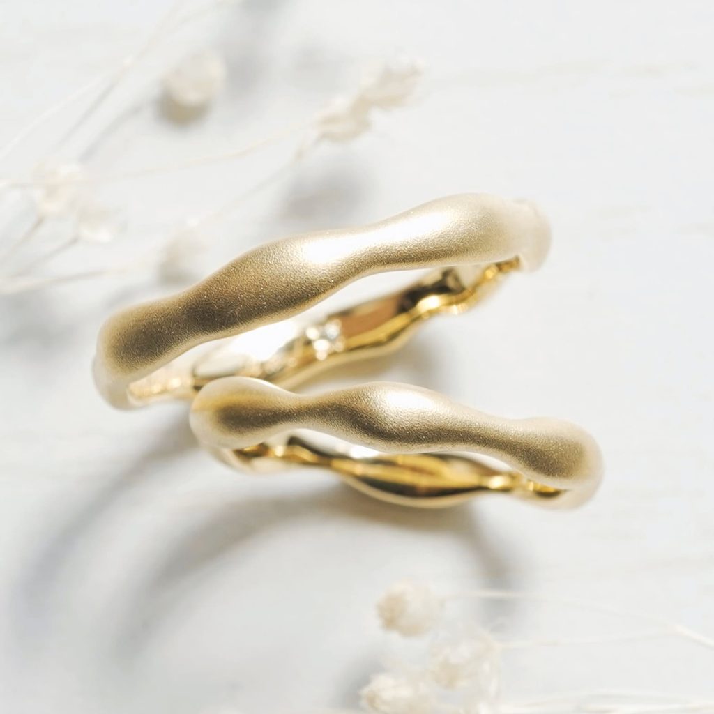 部分的に膨らみをもたせた手作り結婚指輪。 好みで強弱をつけていただきました。 素材はどちらもK18イエローゴールド素材です。 表面は艶消しを施していただきました。