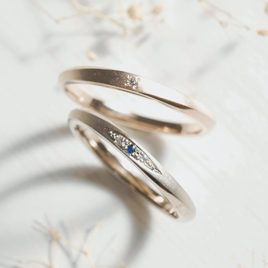 手前の指輪はK18シャンパンゴールド素材。ダイヤモンド2石とサファイアを1石留めています。