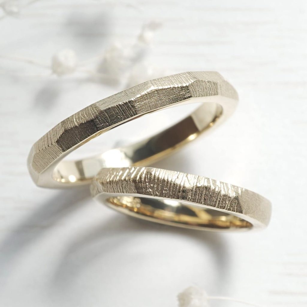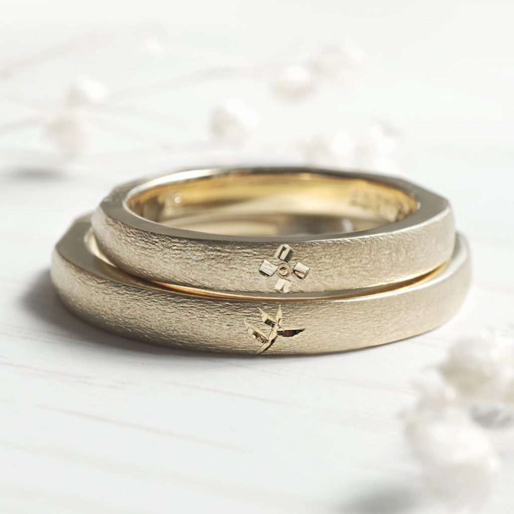 WAXコースで手作りいただいたK18イエローゴールドの結婚指輪。 表はフラットな表面に梨地加工を施し、花柄彫りを加えています。 裏側は凸凹なデザインに仕上がっています。