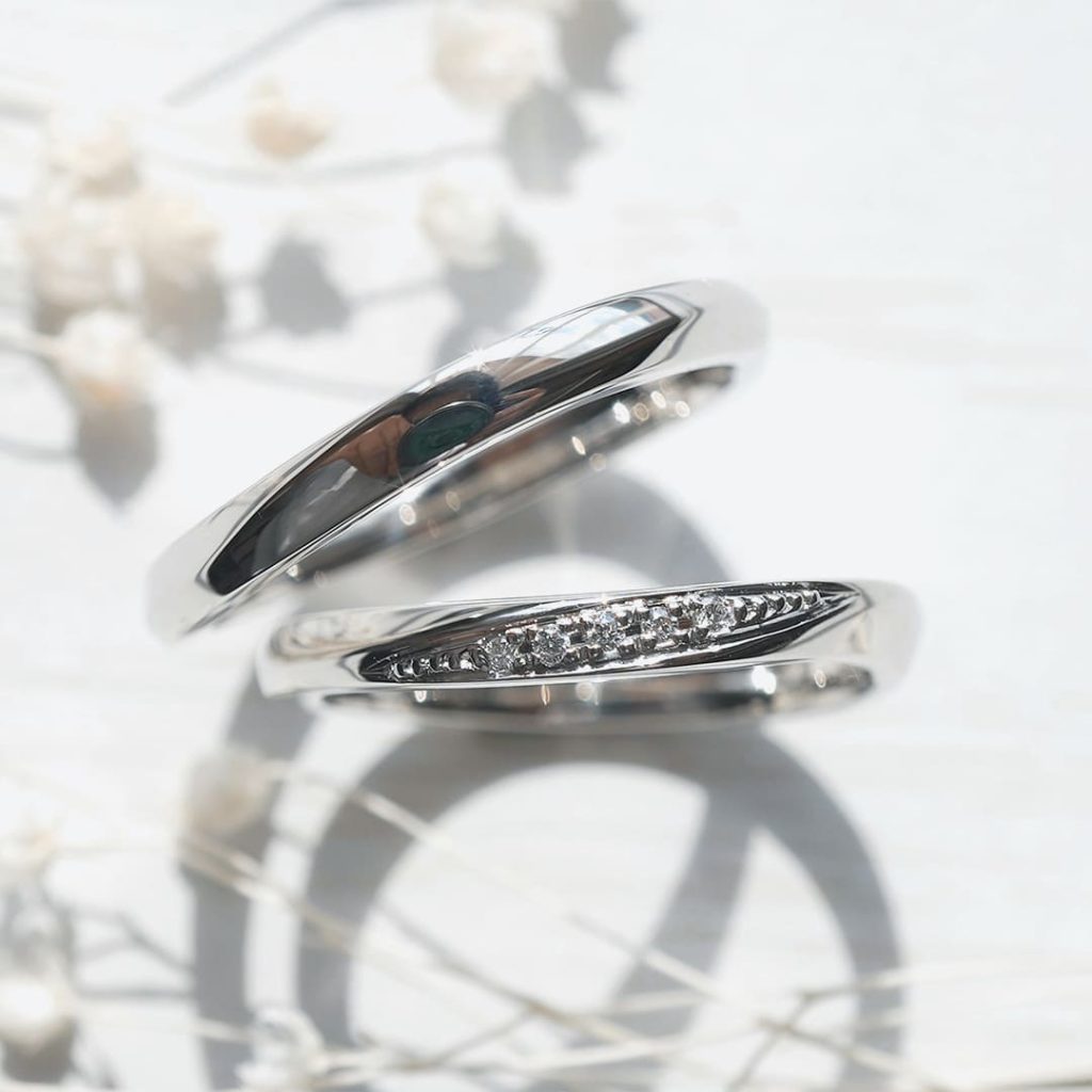 プラチナ素材の手作り結婚指輪。 長いひねりが美しい曲線を生むリングに仕上がっています。 lady'sリングにはダイヤモンドが5石留まっています。