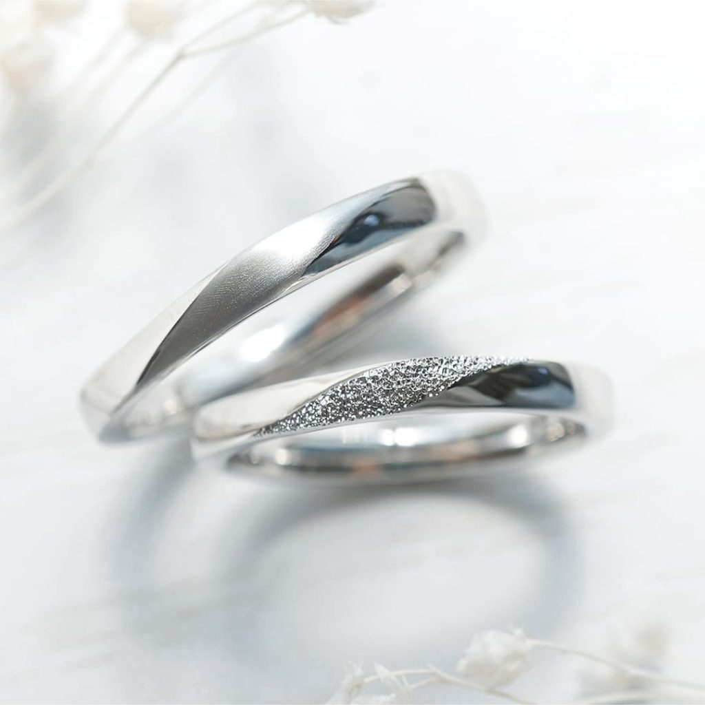 彫金COURSEで手作りいただいた結婚指輪。 指輪のひねりが美しい曲線を生んでいます。 どちらもプラチナ900素材で、旦那様は中央ラインに艶消しを、 奥様はスターダスト加工を施しています。