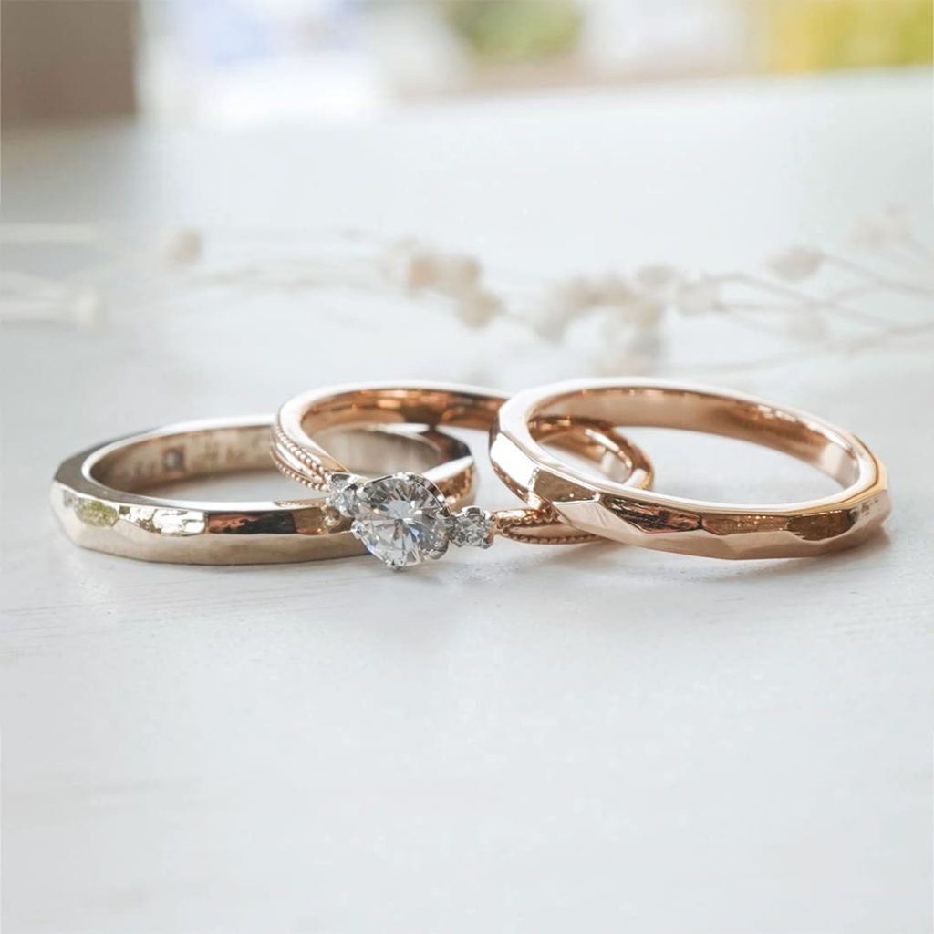 凸凹した表面がオリジナル感満載の指輪。旦那様はK18シャンパンゴールド素材、