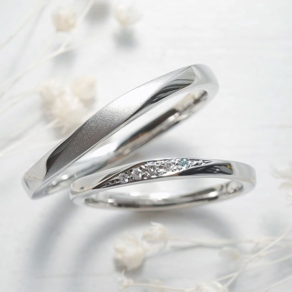 ひねりデザインが特徴的な手作り結婚指輪。 どちらもプラチナ900素材です。 旦那様リングには艶消しを施しています。 奥様リングはダイヤモンド4石とアクアマリンを1石留めています。
