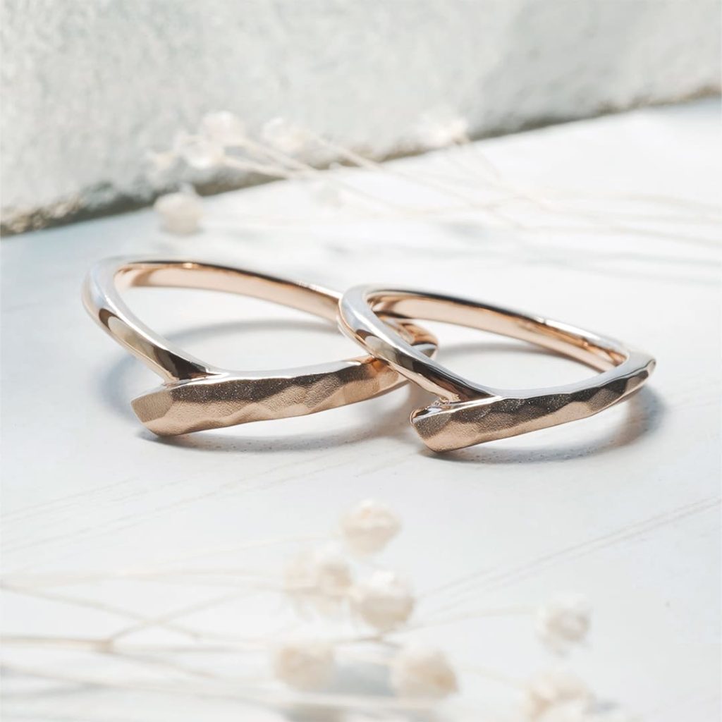 K18ピンクゴールド素材の手作り結婚指輪。 V字形状で一部分に槌目加工を施しています。 槌目部分は光りすぎないように艶消し(ホーニング)を加えています。
