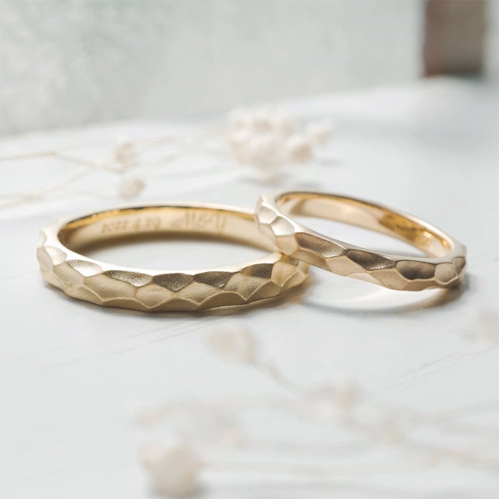 WAXで槌目模様を彫ったデザイン。 旦那様はK18ライムゴールド、奥様はK18ピンクゴールドで仕上げています。 表面は槌目の上から艶消し(ホーニング)加工しています。