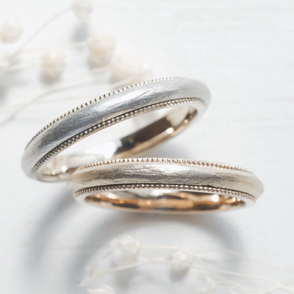 奥様は表面がK18シャンパンゴールド、ミルグレインと内側がK18ピンクゴールド仕上げです。