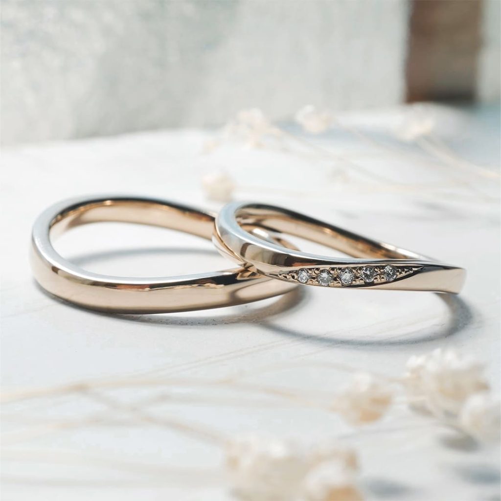 滑らかなウェーブデザインが特徴的な手作り結婚指輪。 どちらもK18シャンパンゴールド素材で、鏡面仕上げです。 奥様のリングには斜めにダイヤモンドを5石留めています。