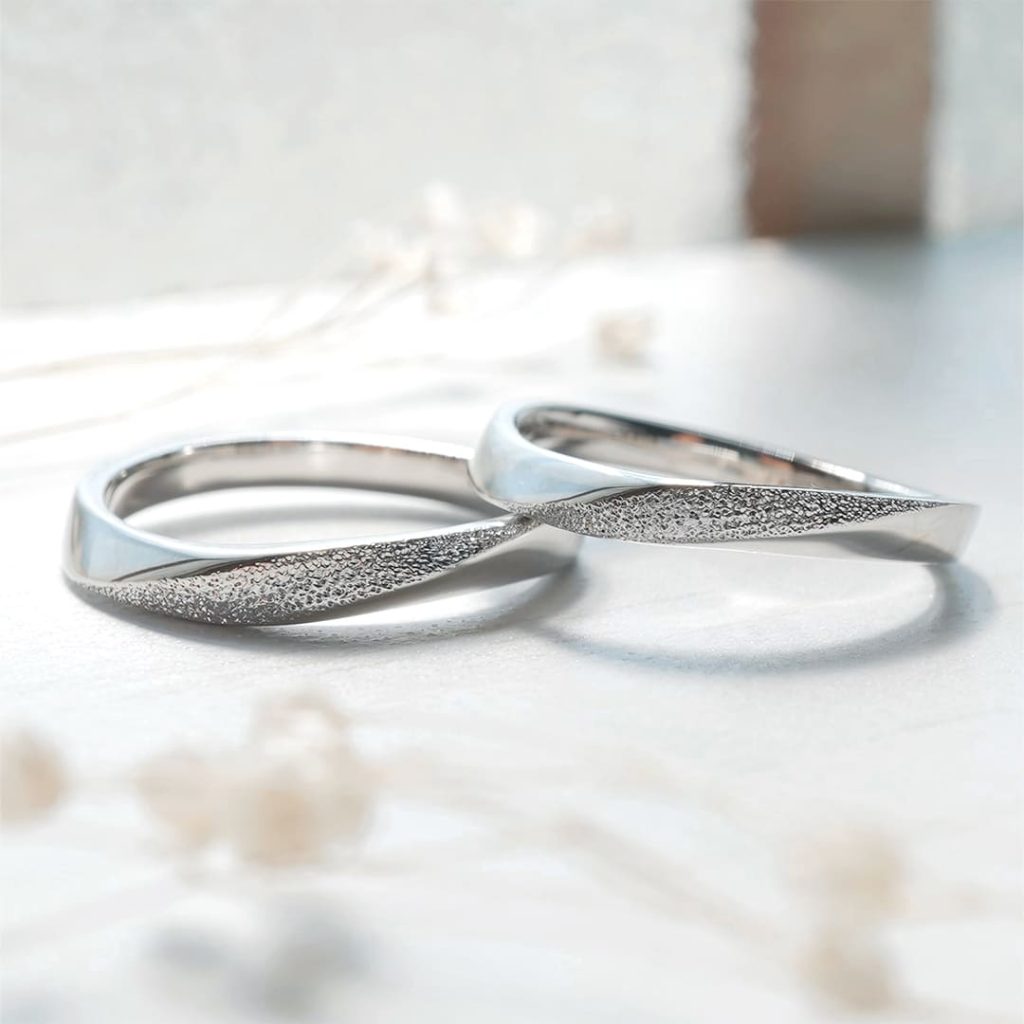 ひねりウェーブが美しいデザインの手作り結婚指輪。 ひねり中央にはスターダスト加工を施しています。 滑らかなウェーブとひねりが特徴的な指輪です。