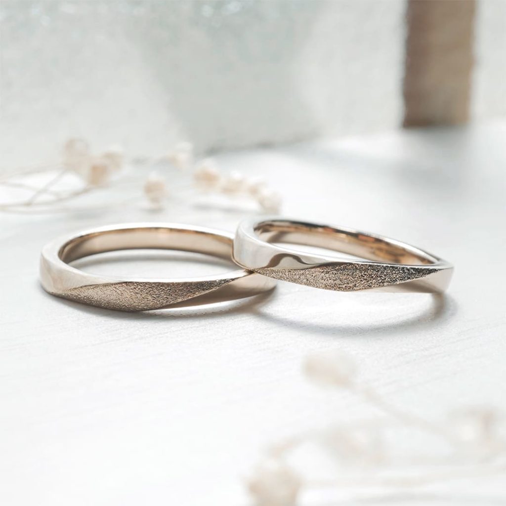 ひねりのデザインが特徴的な手作り結婚指輪。 素材はK18シャンパンゴールドです。 中央ラインにはスターダスト加工でキラキラな仕上げを施しています。