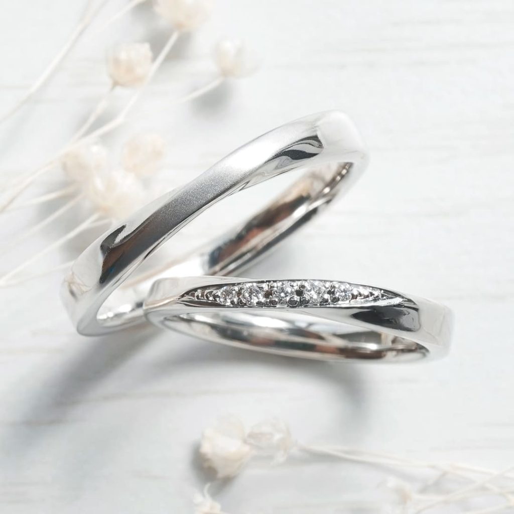 メビウス型の手作り結婚指輪。 素材はどちらもプラチナ900です。 それぞれ中央ラインに好みの表面加工(ホーニング)、ダイヤモンドを留めています。