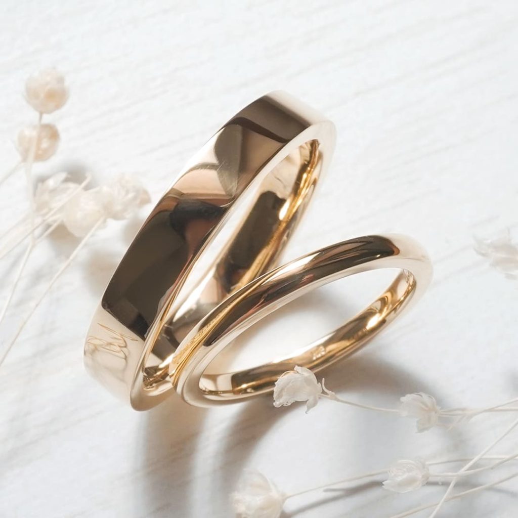 旦那様は幅太デザインの平打ち結婚指輪、奥様は甲丸が特徴的な手作り結婚指輪です。