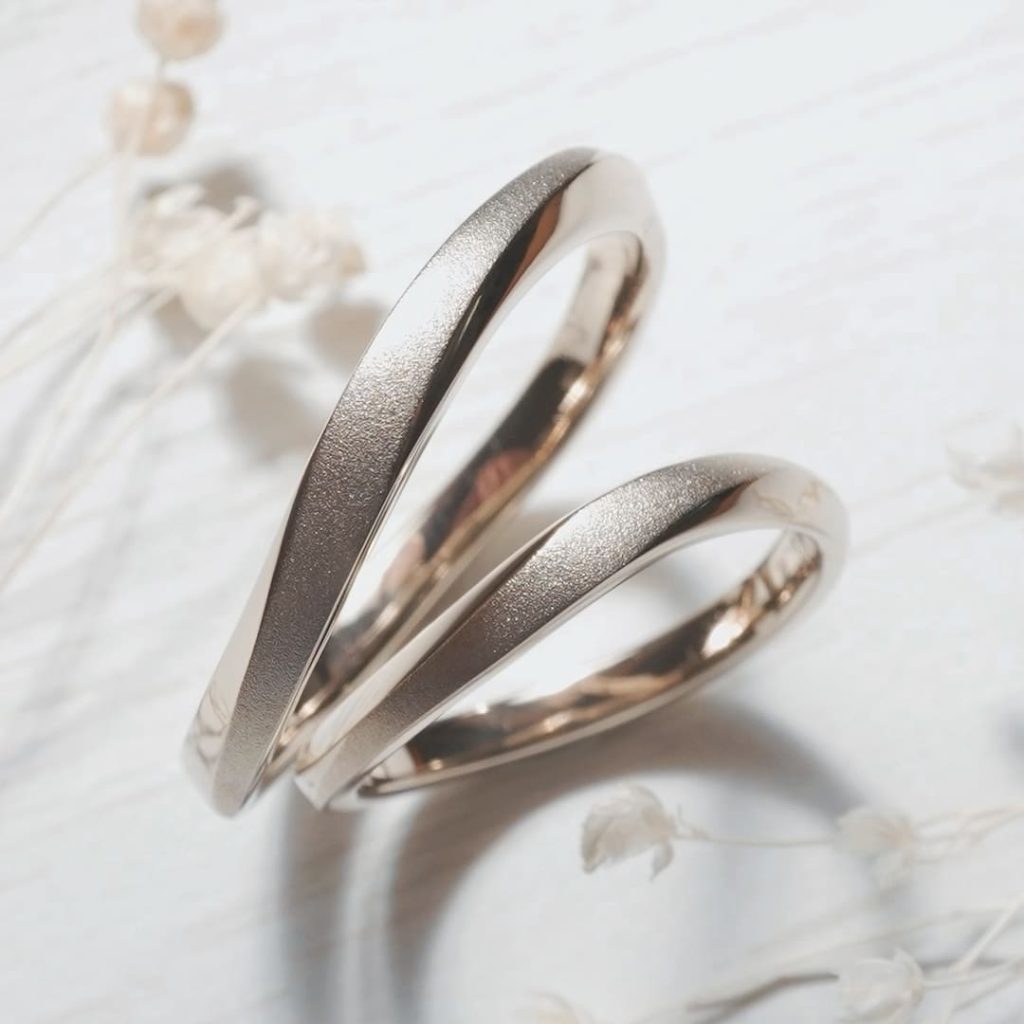 ウェーブひねりが美しい曲線に見える手作り結婚指輪。 どちらも素材はK18シャンパンゴールド素材です。 中央ラインはホーニング加工(艶消し)を施しています。
