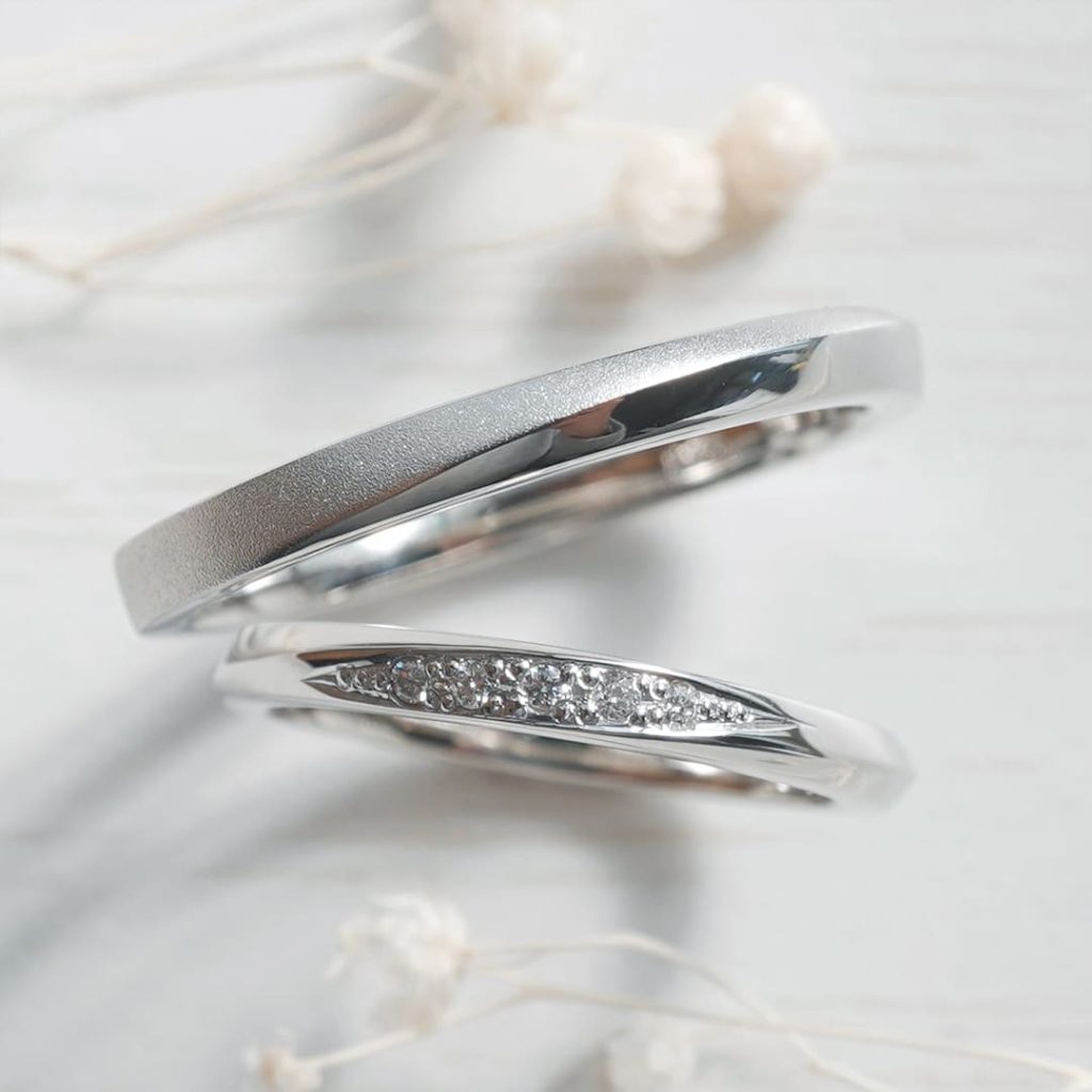 プラチナ900素材の手作り結婚指輪。 長いひねりが特徴的なリングです。 旦那様は艶消しを部分的にかけています。 奥様はダイヤモンドを5石留めて華やかな仕上げに。