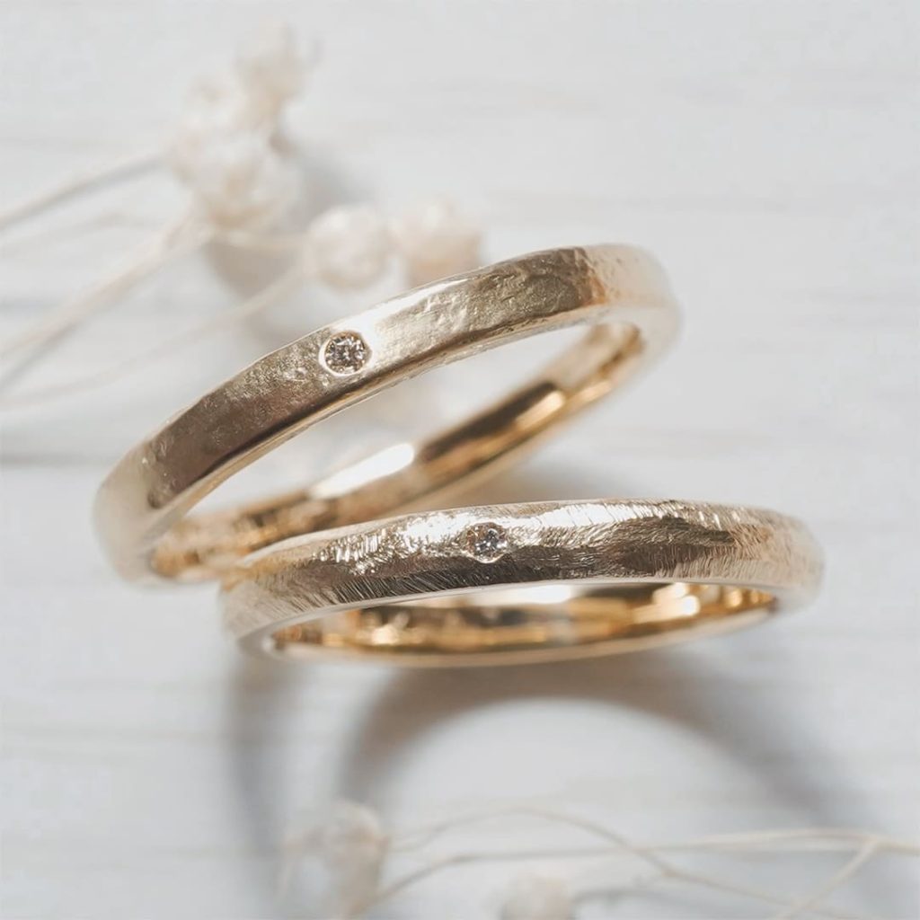 結婚指輪彫金COURSEで手作りいただいた味のあるデザインリング。 旦那様はハンマーテクスチャー仕上げ、奥様はヤスリ跡を残した個性的表面仕上げです。 どちらも双子ダイヤモンドを留めています。